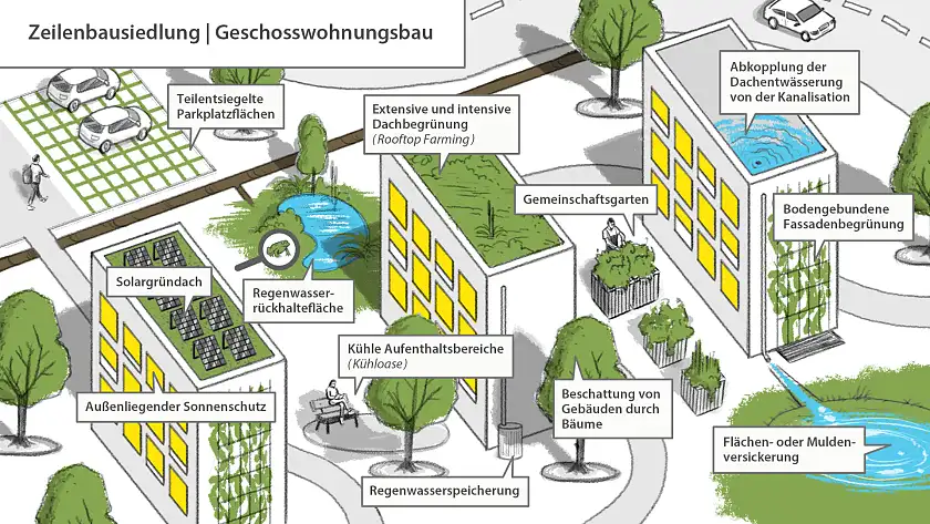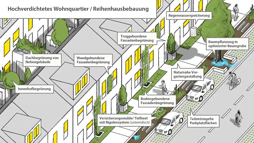 Für die Stadtstrukturtypen wurden im Nachgang Illustrationen erstellt. Sie fassen jeweils die entsprechenden Klimaanpassungsoptionen gestalterisch zusammen.